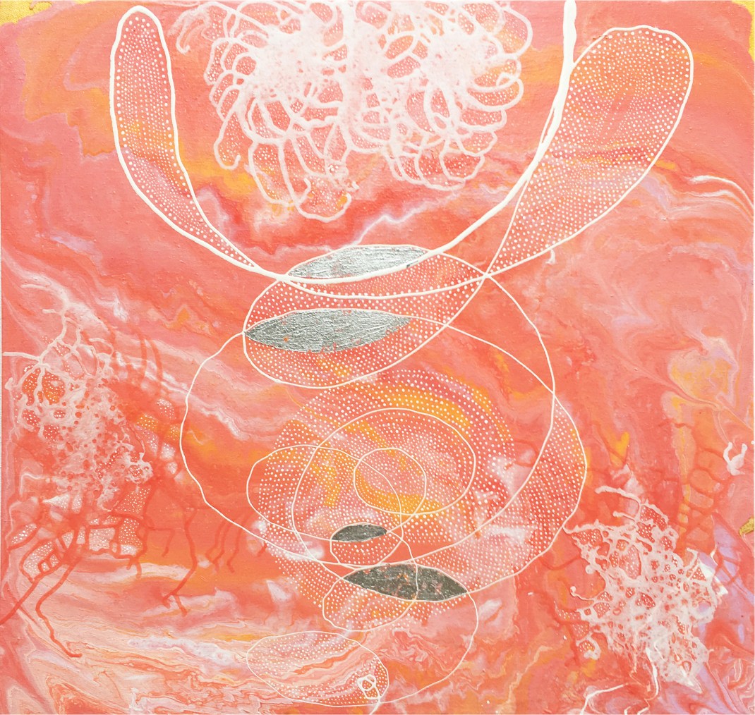 Zooxanthellae: Crown Jewels of the Living Sea | 30 x 31 inches | Acrylic, enamel, silver leaf on canvas | 2019 (Available to purchase US$ 595)Zooxanthellae are light sensitive algae that affects the colour frequency of corals and help indicate their health according to the presence of light and other elements.