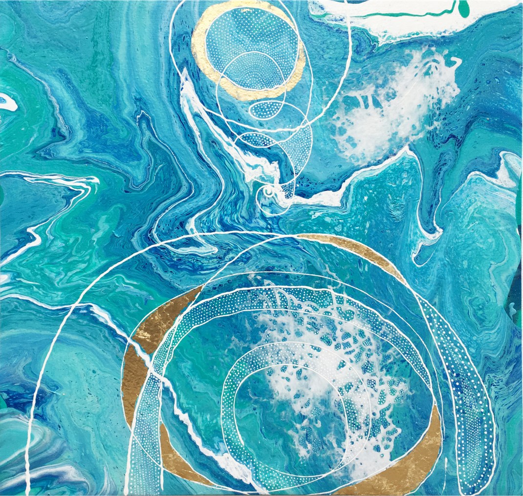 Paz Del Mar (Sea of Peace) | 30 x 31 inches | Acrylic, enamel, gold leaf on canvas | 2019 (Available to purchase US$ 595 | On Hold)“Sea of Peace” is the ocean pool we all want to dive into – to immerse and emerge into purification of being. This painting anchors the balance of “oneness” in alignment to one’s dharma – life’s meaning and purpose.