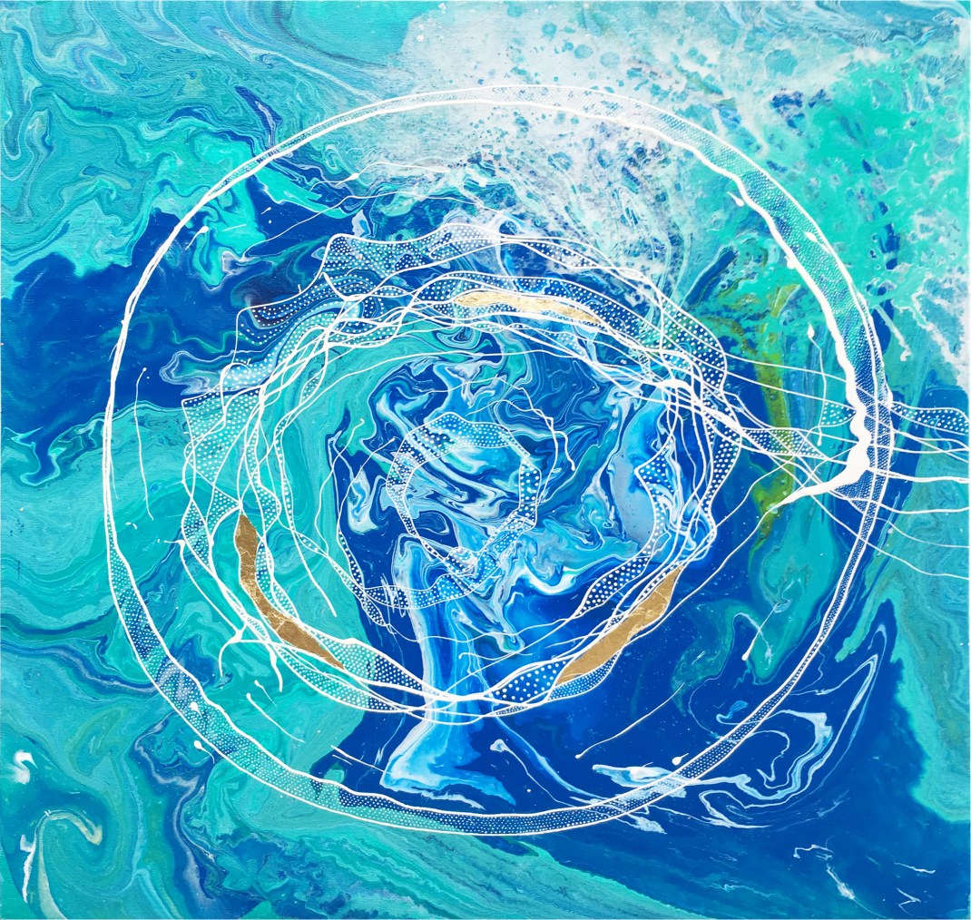 Dharma Mandala: Nucleus of the Mystic Sea | 30 x 31 inches | Acrylic, enamel, gold leaf on canvas | 2019 (Available to purchase US$ 595 | SOLD)Our lives wheel around the infinite Circle – floating in the cradle of the mystic sea. When we surrender in the ebb and flow of life’s intention, we allow ourselves to freely swim ‘round the Mandala – having to experience all emotional tides; feeling the ecstatic joy in moments of happiness; the blues when we are sad, yet allowing our tears to drop into the ocean’s embrace of deep loving-kindness. It’s all that is and let it be.